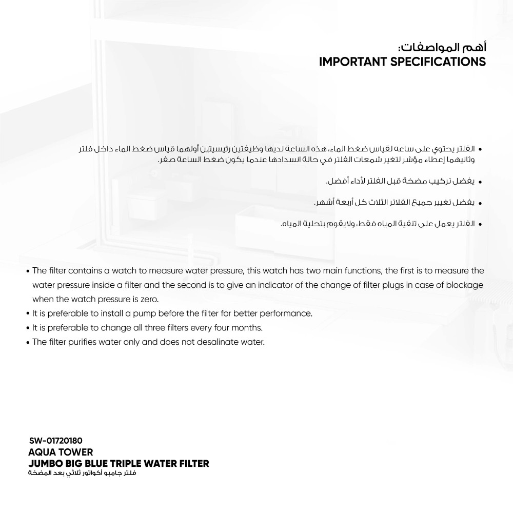 يقوم فلتر جامبو أكواتور بتنقية وتصفية الماء على ثلاثة مراحلة من أي شوائب مثل الكلور والصدأ والأتربة، لماء نظيف تماماً لاستخدامات الإستحمام والغسيل والاستخدام المنزلي .