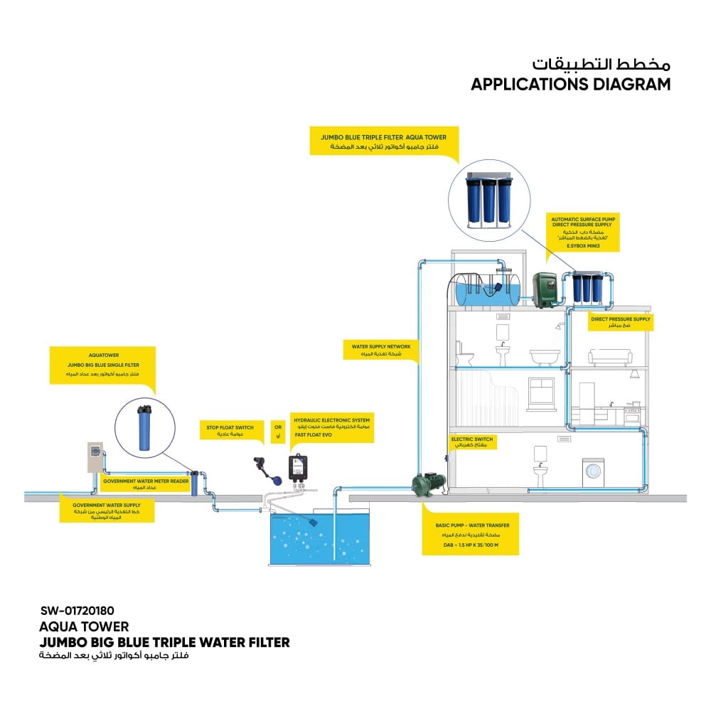فلتر جامبو من أكواتور لتنقية مياه المنزل يتم تركيبه بعد الخزان العلوي والمضخة لسطح المنزل.