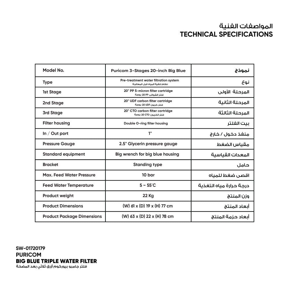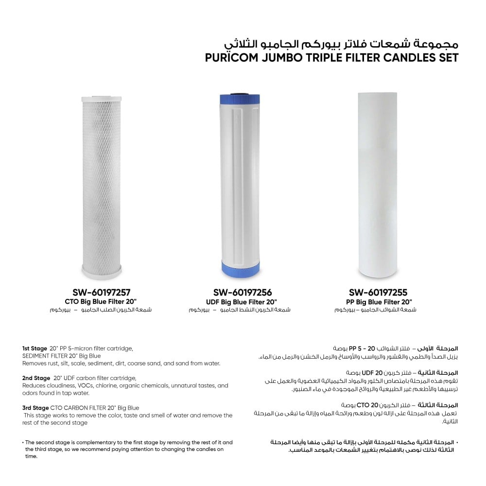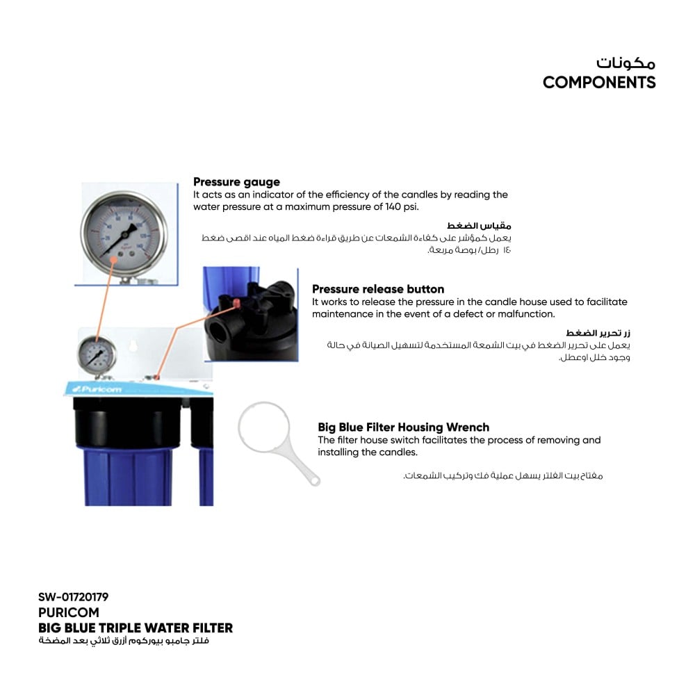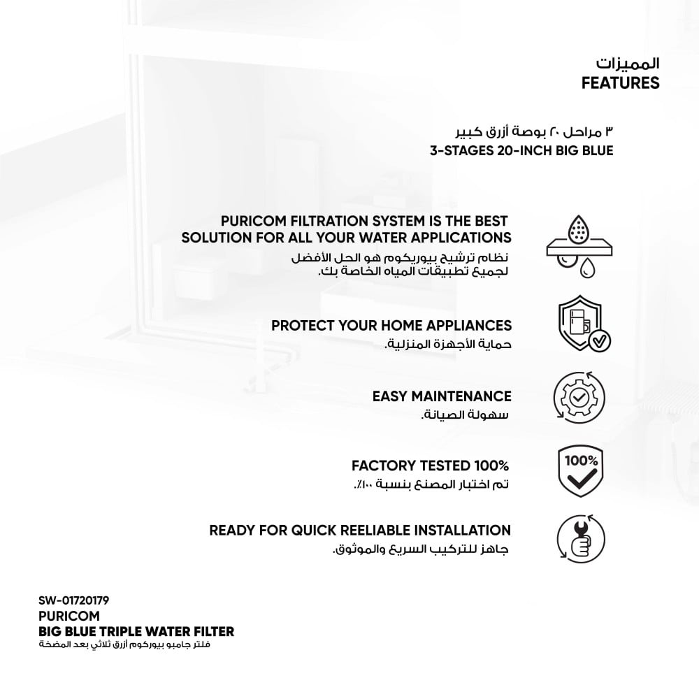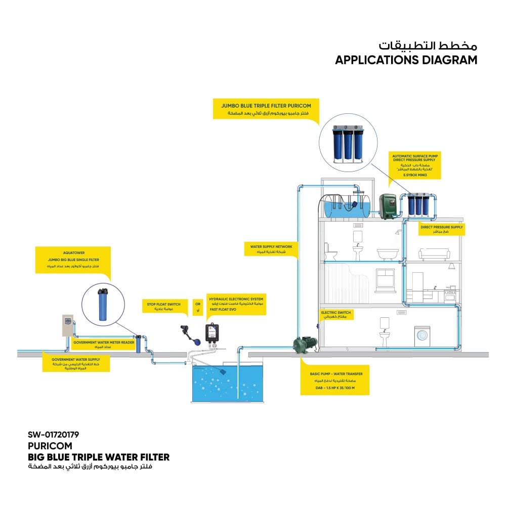 الوصففلتر جامبو الثلاثي لتنقية مياه المنزلفلتر جامبو من بيوركم لتنقية مياه المنزل يتم تركيبه بعد الخزان العلوي والمضخة لسطح المنزل.يقوم بتنقية وتصفية ...