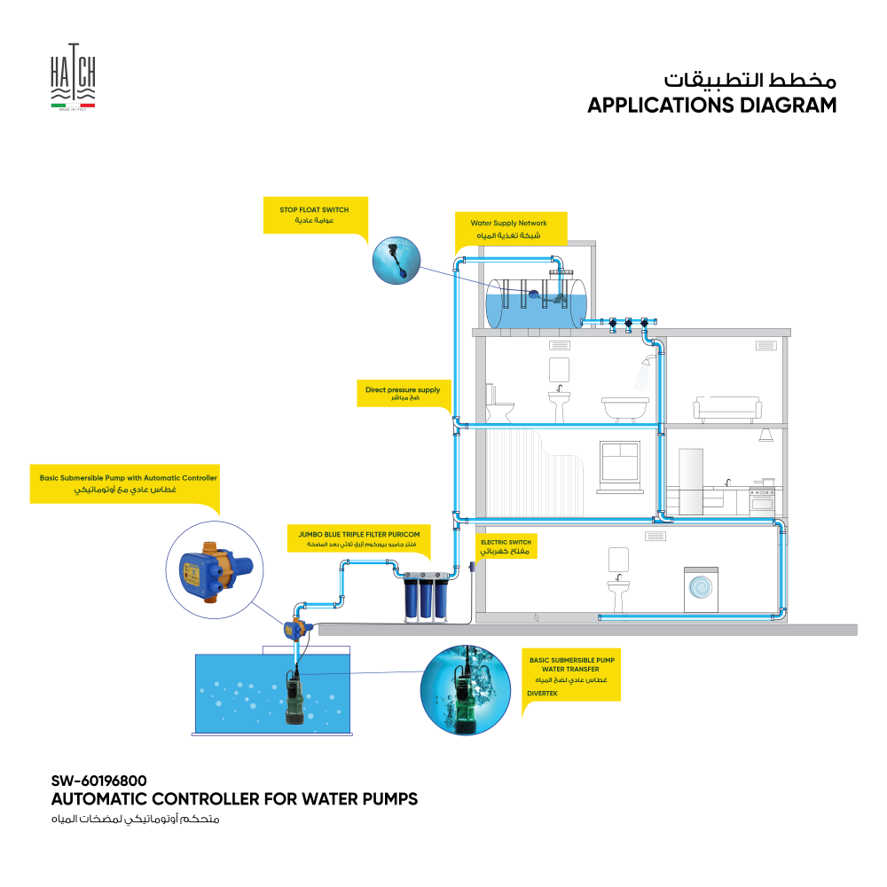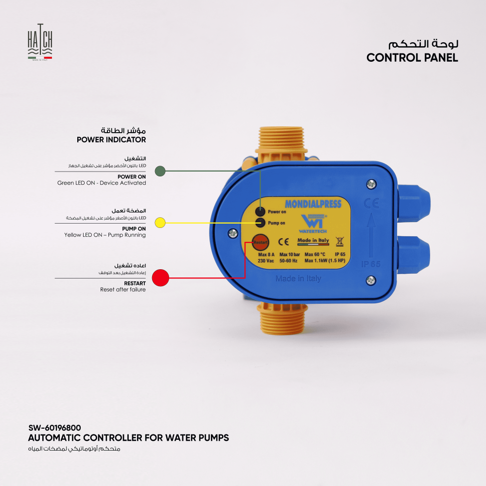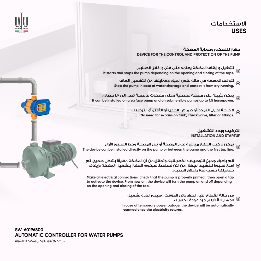 3. يوقف المضخة في حالة نقص المياه وحمايتها من التشغيل الجاف.