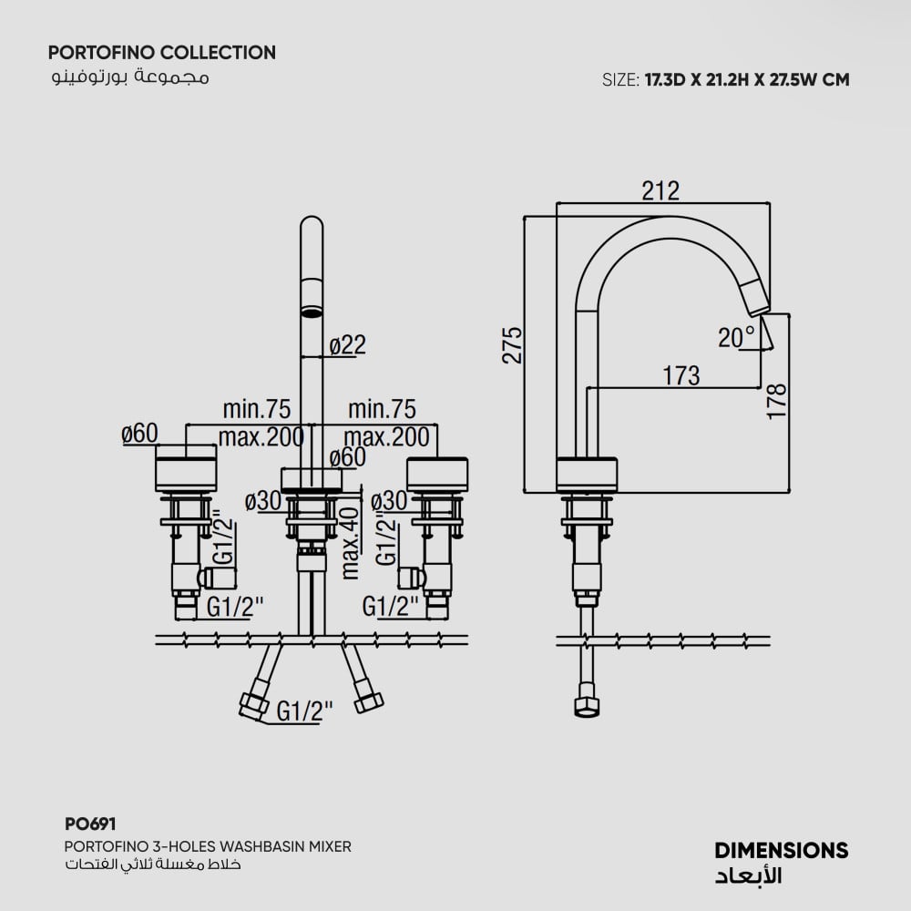 الأبعاد: العمق 21.2 - الارتفاع 27.5 - ارتفاع مخرج الماء عن السطح 17.3 سم