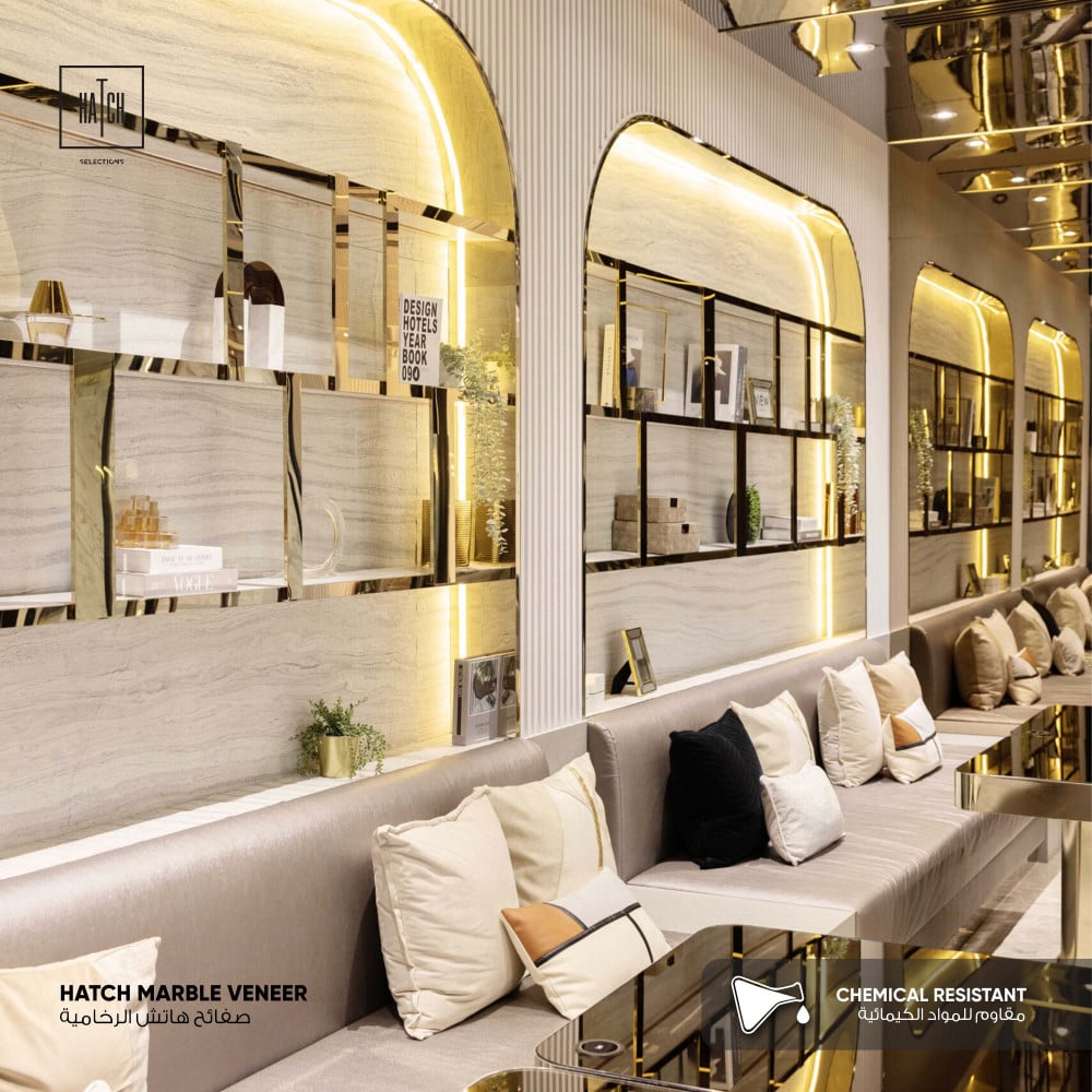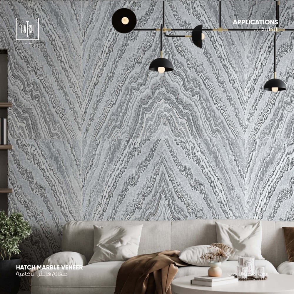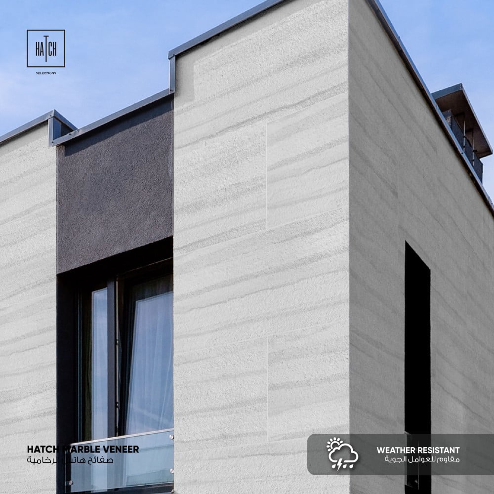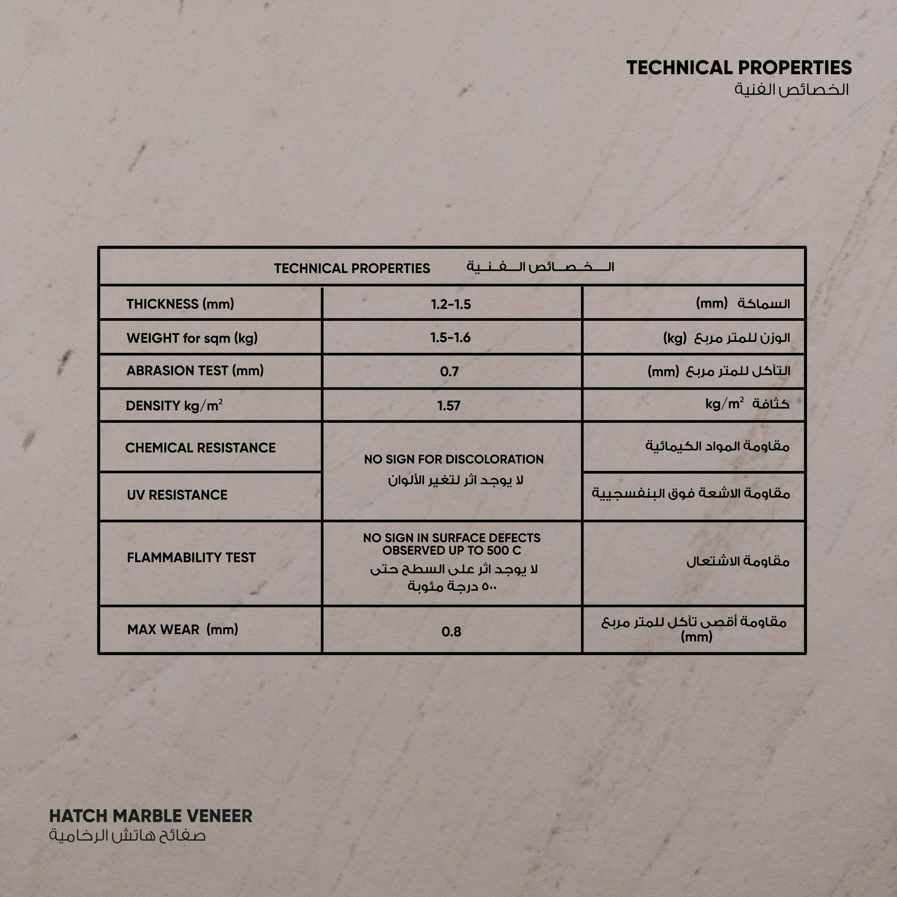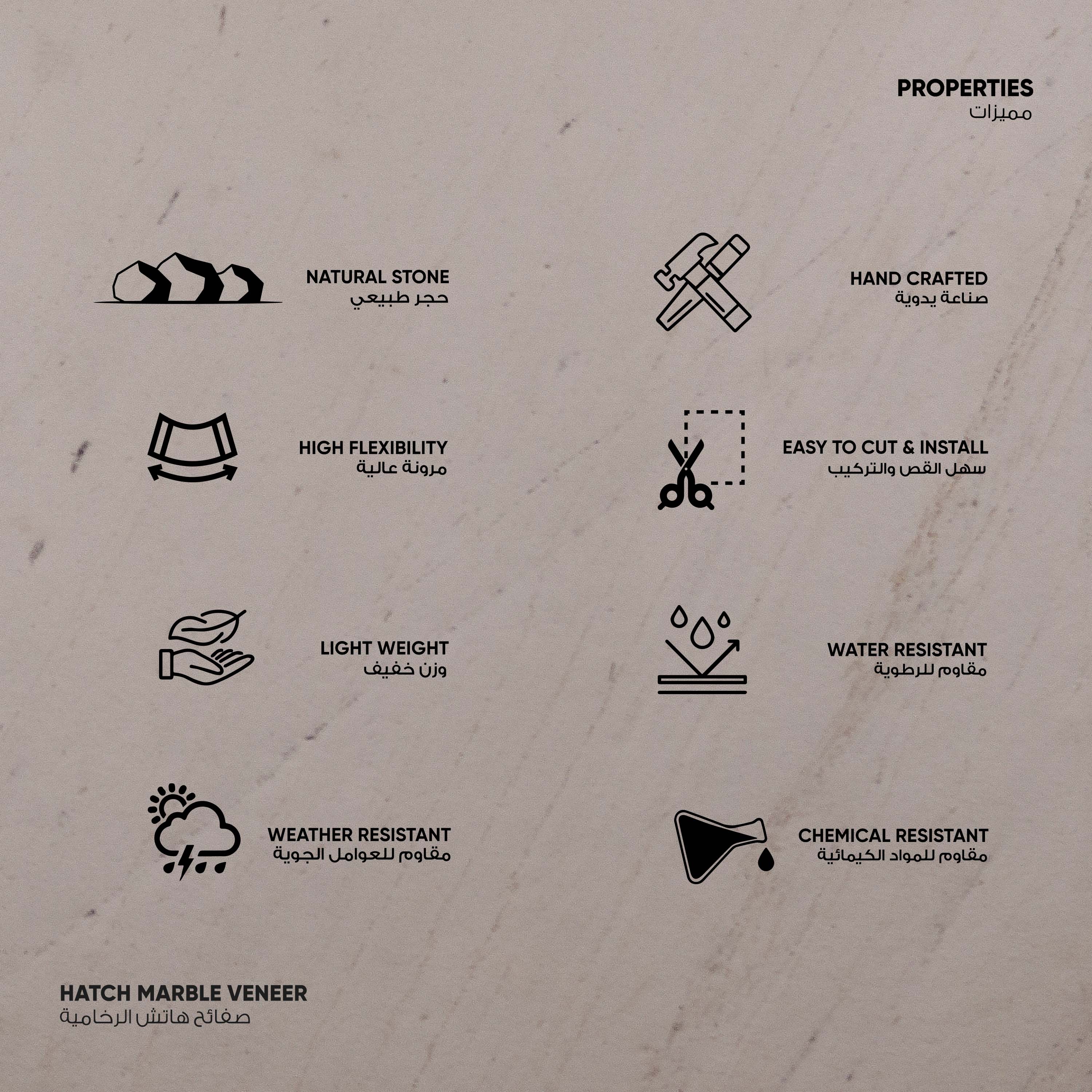 المادة: هو عبارة عن حجر طبيعي 100% معزز بطبقة من الالياف والبلوسترين ريزن لضمان تماسك السطح ومقاومة مختلف العوامل الجوية, للاستخدام الداخلي والخارجي على مختلف الاسطح الانشائيه, كالخشب, الخرسانة, بروسلان ومعظم الواح البناء.