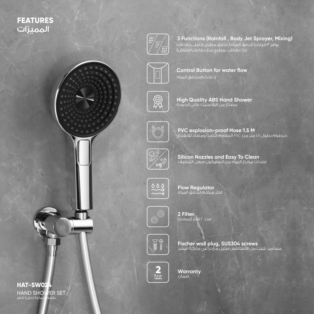 المادة: سماعة دش (شاور) مع حامل من البلاستيك ، خرطوم (لي /هوز) من PVC ومسامير تثبيت من الاستانلس ستيل 304